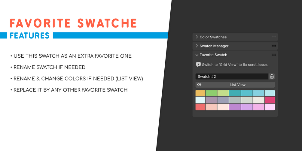 • Swatch Manager: Create, remove, rename and organise all your swatches